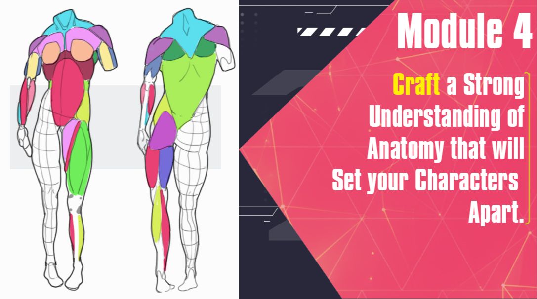 The course includes 6 modules with over 10+Â hours of training and practice. It also features 28Â full-length lessons that guide you step-by-step through character design. You can pause and replay each video as many times as you want.